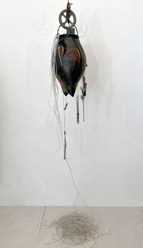 Senegalese well water bag, oil pastel, plastic tubing, utensils, pulley