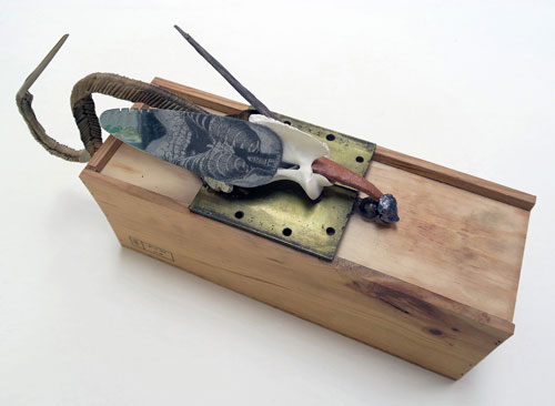 wood box, brass hinge, silk with printed drawing, animal bone, raffia, ceramic