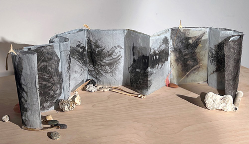 organdy with images, stones, bones, ten panels, each panel approximately