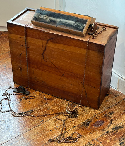 wood box, ceramic, wood, screen, window chain, pulleys 21.5" x 23" x 9" 2025